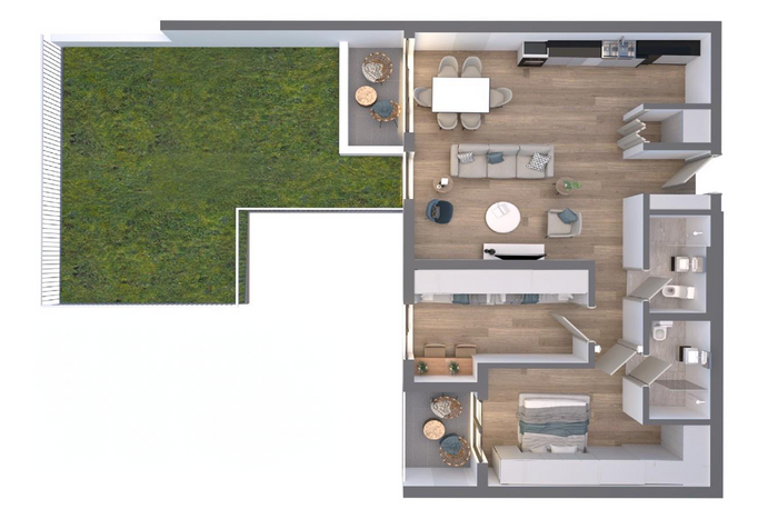 Die Wohnung ist nach Osten ausgerichtet und hat folgende Raumaufteilung: Wohnzimmer, Küche, zwei Schlafzimmer, eines davon mit eigenem Bad, zwei Badezimmer, Abstellraum, Terrasse und zwei Balkone.