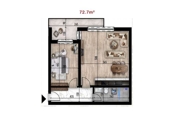 *Die Wohnung mit einer Wohnfläche von 72,7 m² hat folgende Anordnung der Innenräume: Wohnzimmer, Küche mit Essbereich, ein Schlafzimmer, Badezimmer und Balkon.