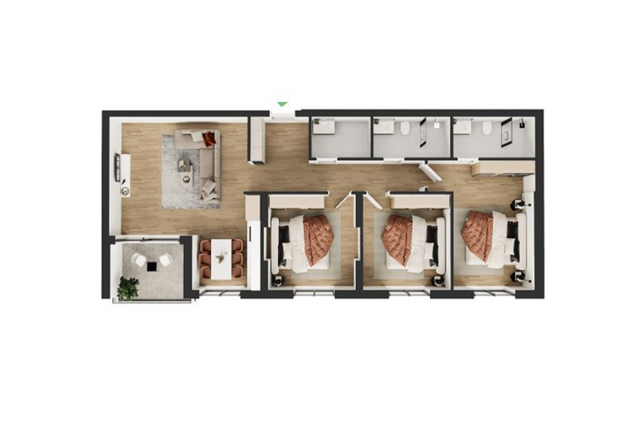 Die Wohnung hat folgende Anordnung der Innenräume: Wohnzimmer, Küche, drei Schlafzimmer, zwei Badezimmer, Abstellraum und Balkon.