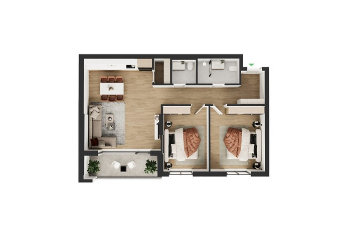 Die Wohnung hat folgende Anordnung der Innenräume: Wohnzimmer, Küche, zwei Schlafzimmer, ein Badezimmer, Toilette, Abstellraum und Balkon.