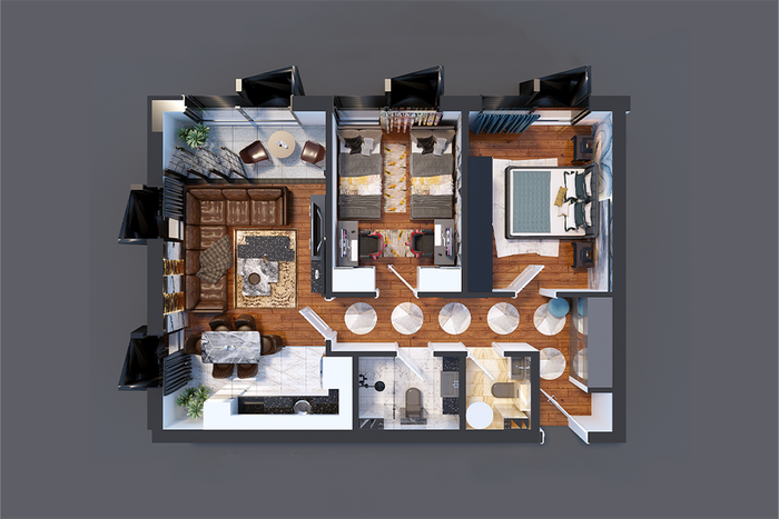 Die Wohnung hat folgende Anordnung der Innenräume: Wohnzimmer, Küche, zwei Schlafzimmer, Badezimmer, WC und Balkon.