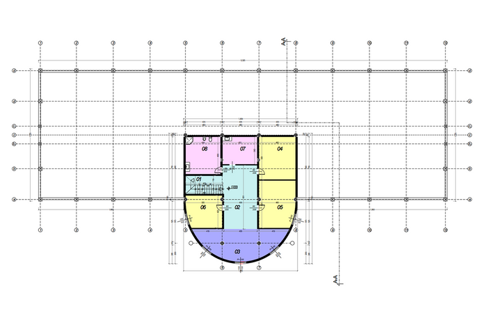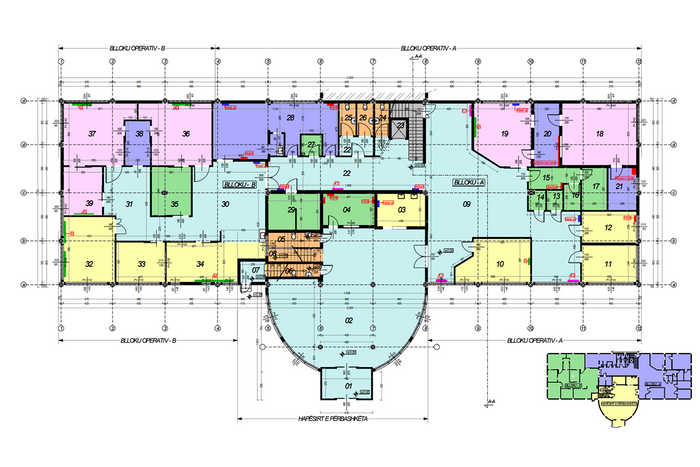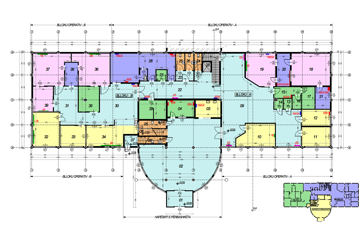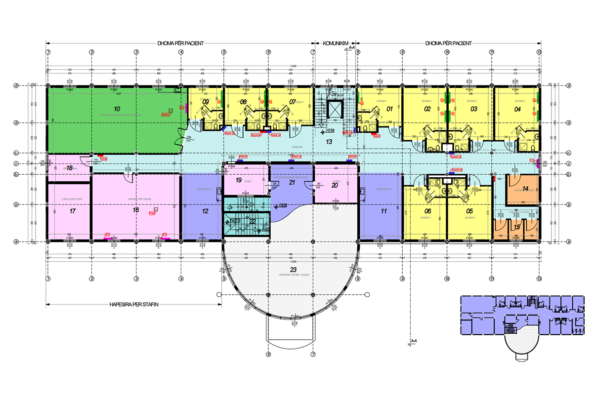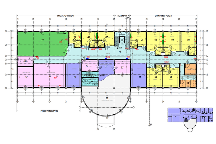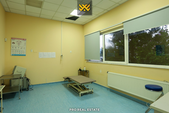 Das Objekt ist nach Osten und Norden ausgerichtet, besteht aus einem Untergeschoss, einem Obergeschoss und einem Dachgeschoss, hat etwa 50 Räume, medizinische Zimmer, Kontrollräume, Badezimmer und technische Räume.