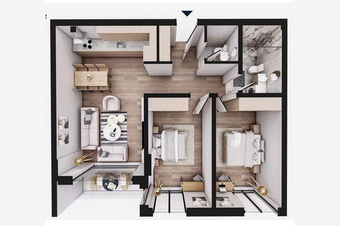 Die Wohnung hat eine Ausrichtung nach Osten mit folgender Anordnung der Innenräume: Wohnzimmer, Küche, zwei Schlafzimmer, Badezimmer, WC und Balkon.