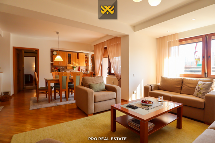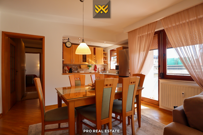 Die Wohnung hat eine Ausrichtung nach Osten, Westen und Süden und verfügt über folgende Anordnung der Innenräume: Wohnzimmer, Küche, zwei Schlafzimmer, Badezimmer, Abstellraum und zwei Balkone.