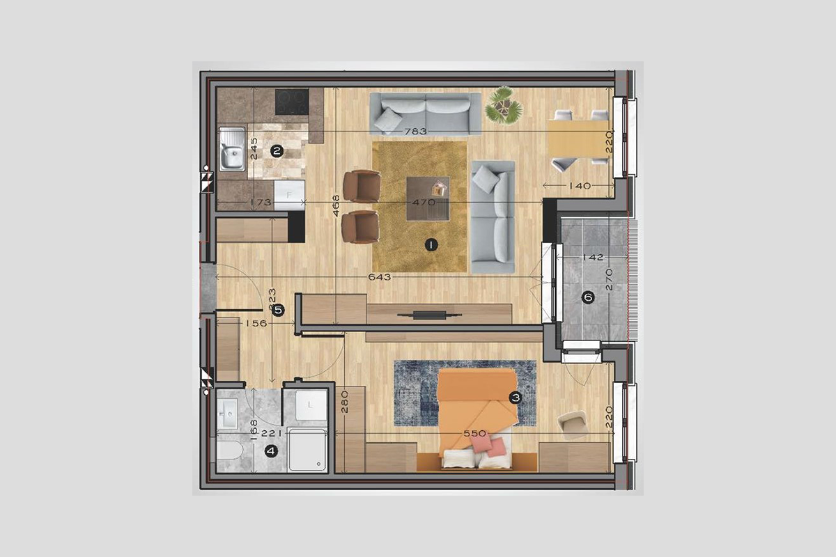 Die Wohnung hat eine Ausrichtung nach Osten und verfügt über folgende Anordnung der Innenräume: Wohnzimmer, Küche, ein Schlafzimmer, Badezimmer, Toilette und Balkon.