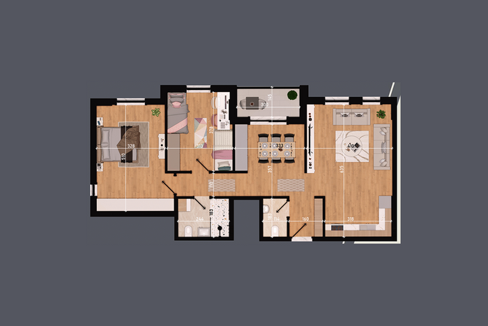 Die Wohnung hat folgende Anordnung der Innenräume: Wohnzimmer, Küche, zwei Schlafzimmer, Badezimmer, WC und Balkon.