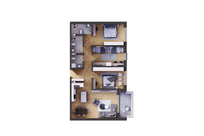 Die Wohnungen befinden sich in verschiedenen Etagen, sind alle dreizimmerig, haben eine Ausrichtung von allen Seiten je nach Nachfrage und haben folgende Anordnung der Innenräume: Wohnzimmer, Küche, drei Schlafzimmer, zwei Badezimmer, eine Toilette und einen Balkon.