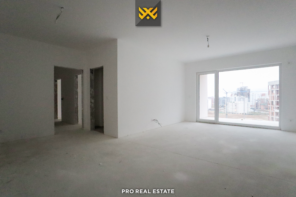 Die Wohnung hat eine Südausrichtung und folgende Anordnung der Innenräume: Wohnzimmer, Küche, drei Schlafzimmer, ein Badezimmer, Abstellraum und Balkon.