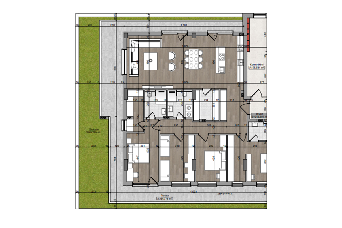 Zum Verkauf steht eine Penthouse-Wohnung mit einer Wohnfläche von 242,80 m² und einer Terrasse mit einer Fläche von 67,93 m², gelegen in Prishtina e Re, im Cima Grand Complex - Lamella B3, gebaut von Cima Construction.