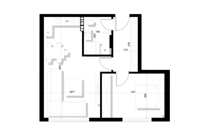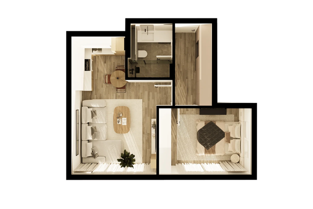 Die Wohnung hat eine westliche Ausrichtung und folgende Raumaufteilung: Wohnzimmer, Küche, ein Schlafzimmer und Badezimmer.
