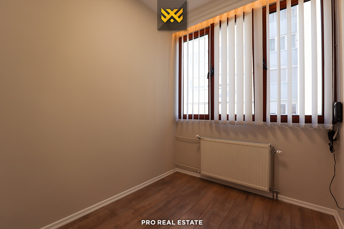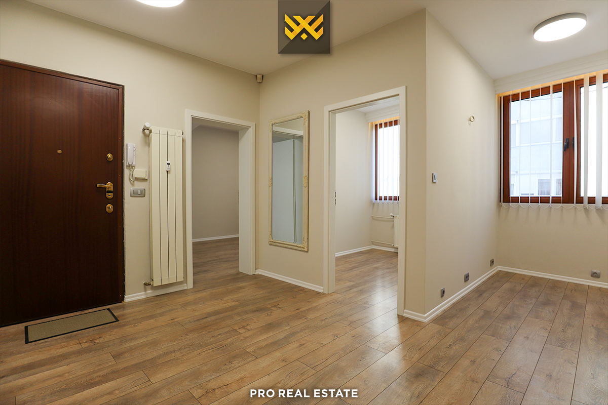 Die Wohnung hat eine Westausrichtung und verfügt über folgende Raumaufteilung: zwei Büroräume, Küche, Bad und Terrasse.