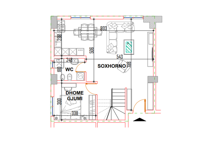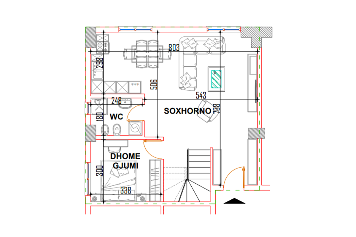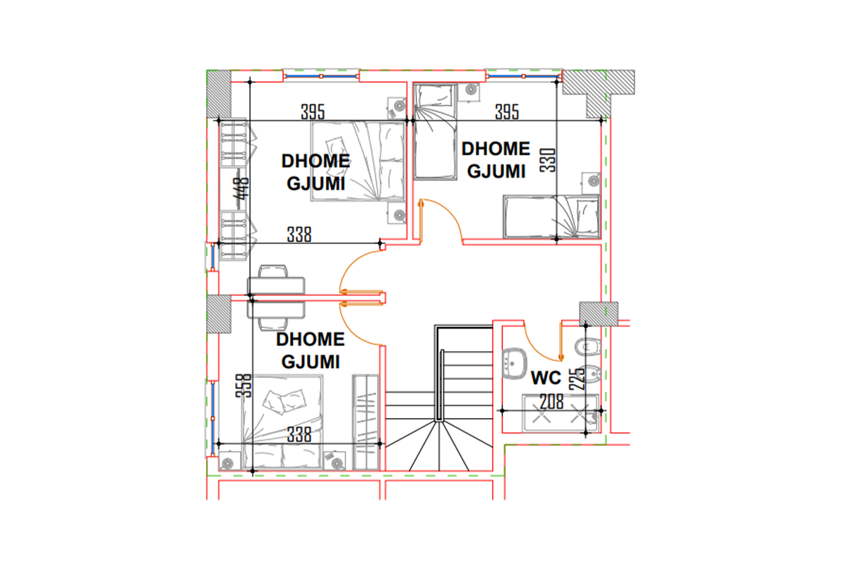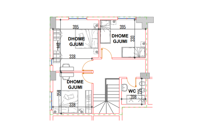 Die Wohnung hat eine Ausrichtung nach Osten und Westen und verfügt über folgende Raumaufteilung: Wohnzimmer, Küche, vier Schlafzimmer und zwei Badezimmer.