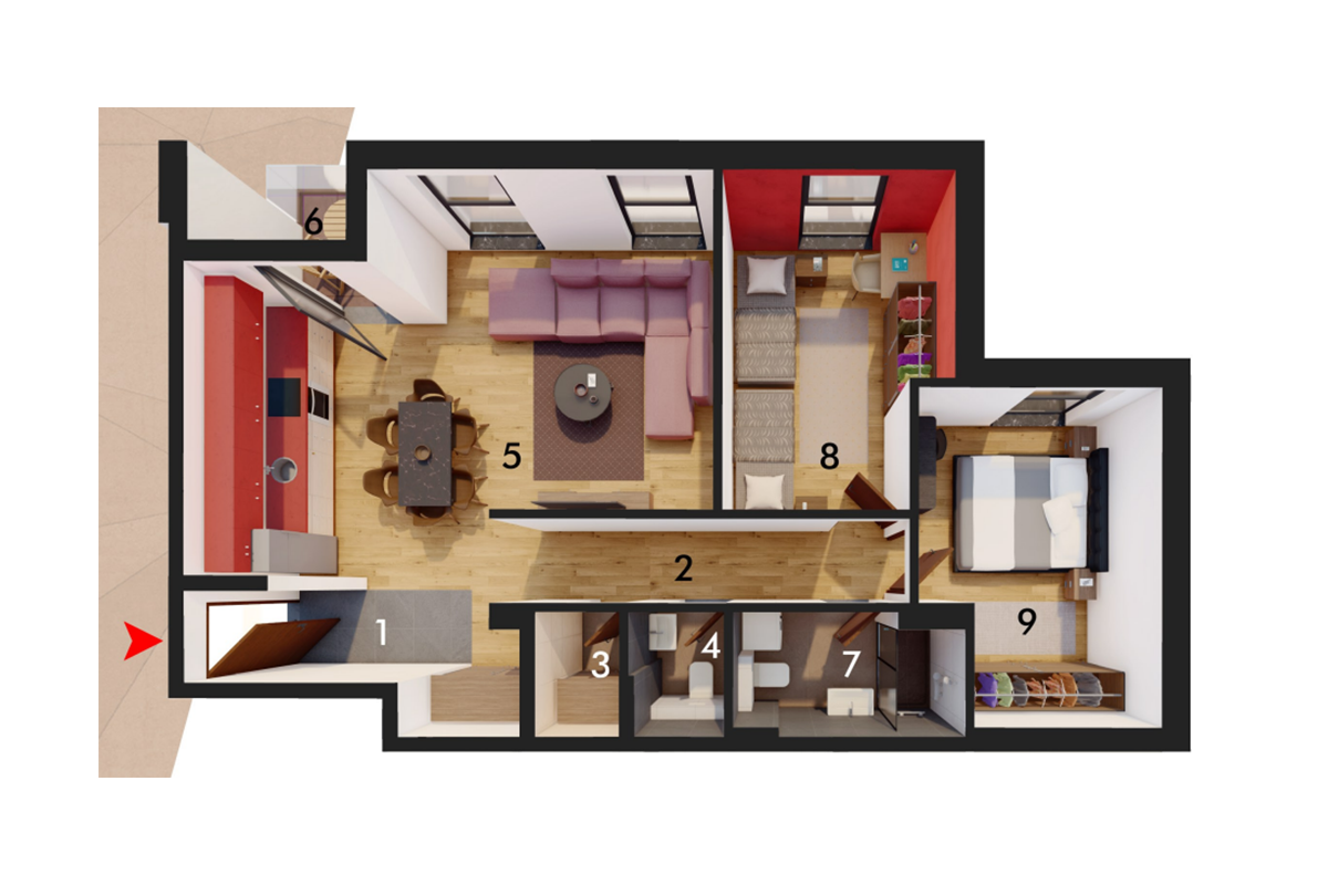 Die Wohnung hat eine Ausrichtung nach Osten und verfügt über folgende Raumaufteilung: Wohnzimmer, Küche, zwei Schlafzimmer, ein Badezimmer, eine Toilette und einen Balkon.