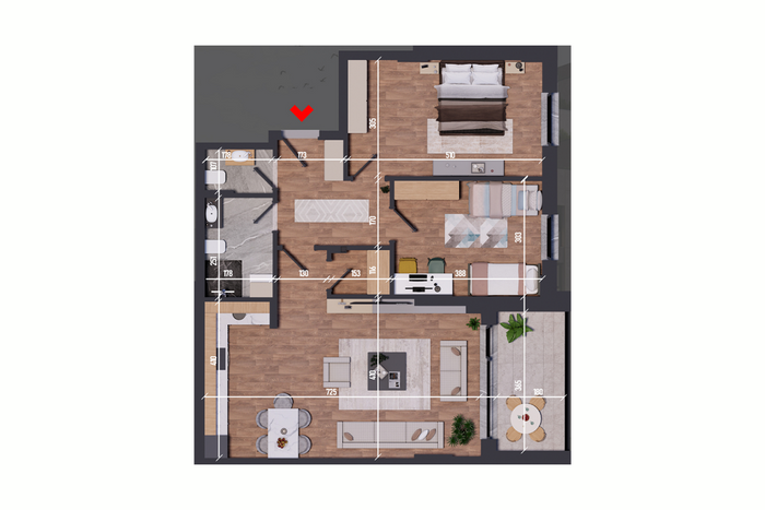 Die Wohnung hat eine Ausrichtung nach Osten und Norden und verfügt über folgende Anordnung der Innenräume: Wohnzimmer, Küche, zwei Schlafzimmer, ein Badezimmer, eine Toilette, Abstellraum, Flur und Balkon.