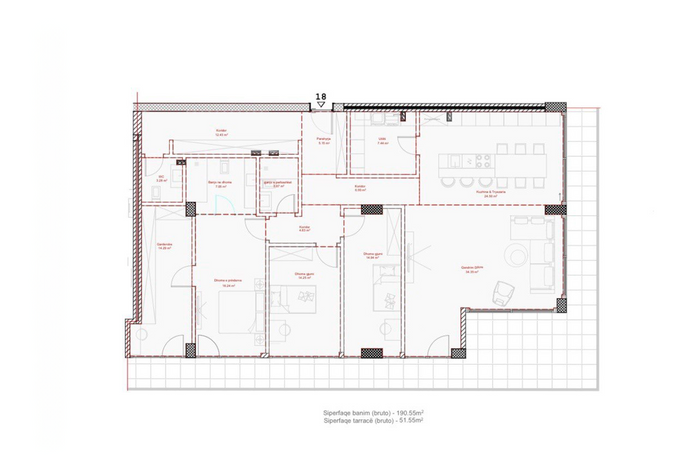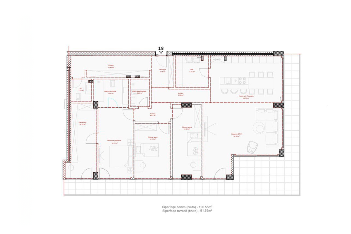 Zum Verkauf steht eine Wohnung mit einer Wohnfläche von 190,55 m² und einer Terrasse mit einer Fläche von 51,55 m², gelegen im Stadtteil Marigona Hill.