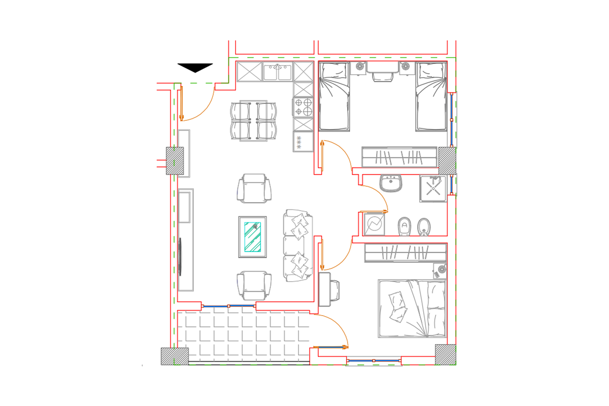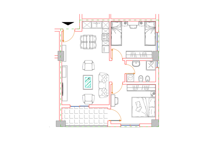 Die Wohnung hat eine Ausrichtung nach Osten und Westen und verfügt über folgende Raumaufteilung: Wohnzimmer, Küche, zwei Schlafzimmer, Badezimmer und Balkon.