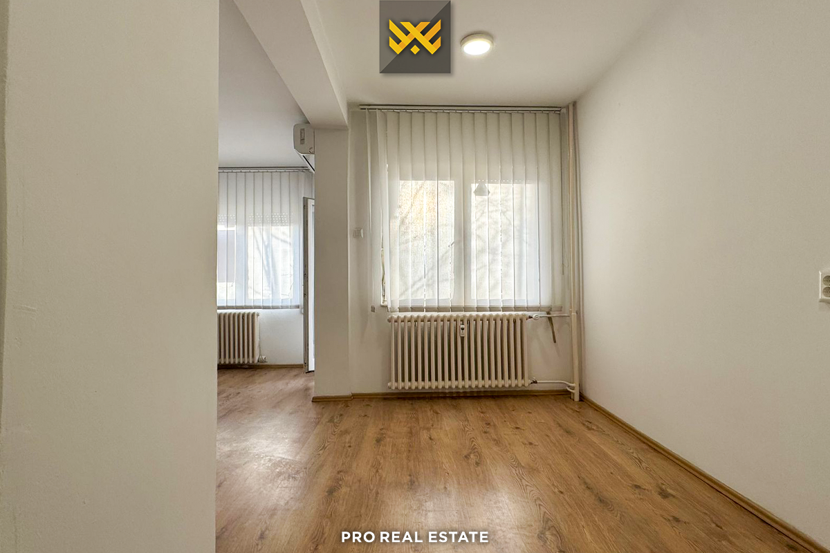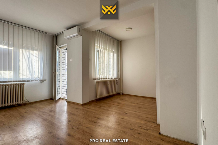 Die Wohnung hat eine Südausrichtung und verfügt über folgende Raumaufteilung: zwei nutzbare Arbeitsräume, ein Badezimmer und einen Balkon.