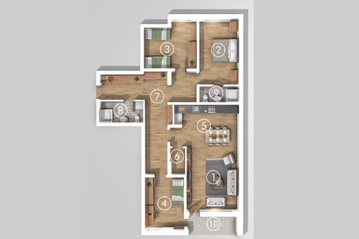 Die Wohnung hat eine Ausrichtung nach Nordwesten und Süden und verfügt über folgende Anordnung der Innenräume: Wohnzimmer, Küche, drei Schlafzimmer, zwei Badezimmer, Toilette, Abstellraum und Balkon.