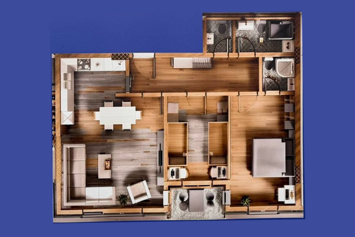 Die Wohnung hat eine Ausrichtung nach Osten und Süden und verfügt über folgende Raumaufteilung: Wohnzimmer, Küche, zwei Schlafzimmer, zwei Badezimmer, Abstellraum und Balkon.