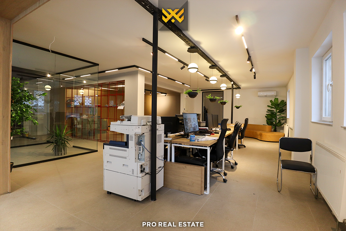 Das Lokal hat eine Ausrichtung nach Westen, verfügt über fünf nutzbare Arbeitsräume, eine Küche, ein Lager und eine Toilette.