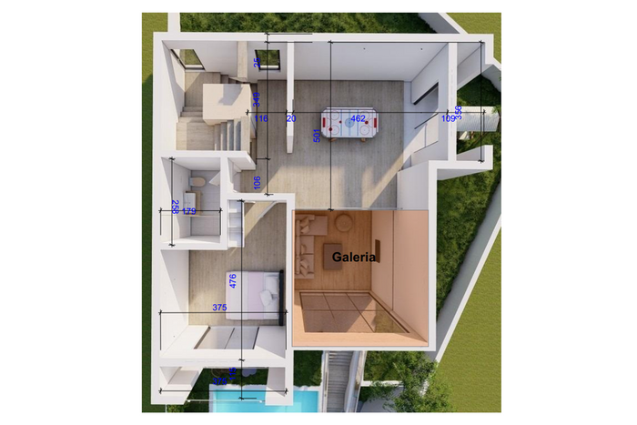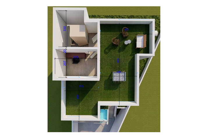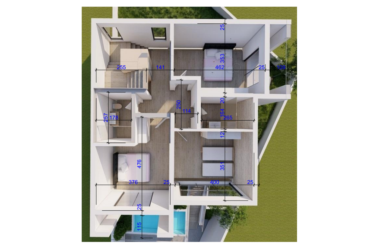 Das Haus befindet sich auf einem Grundstück mit einer Fläche von 4,4 Ar, das einen Pool, Grünflächen sowie ausreichend Parkmöglichkeiten bietet.