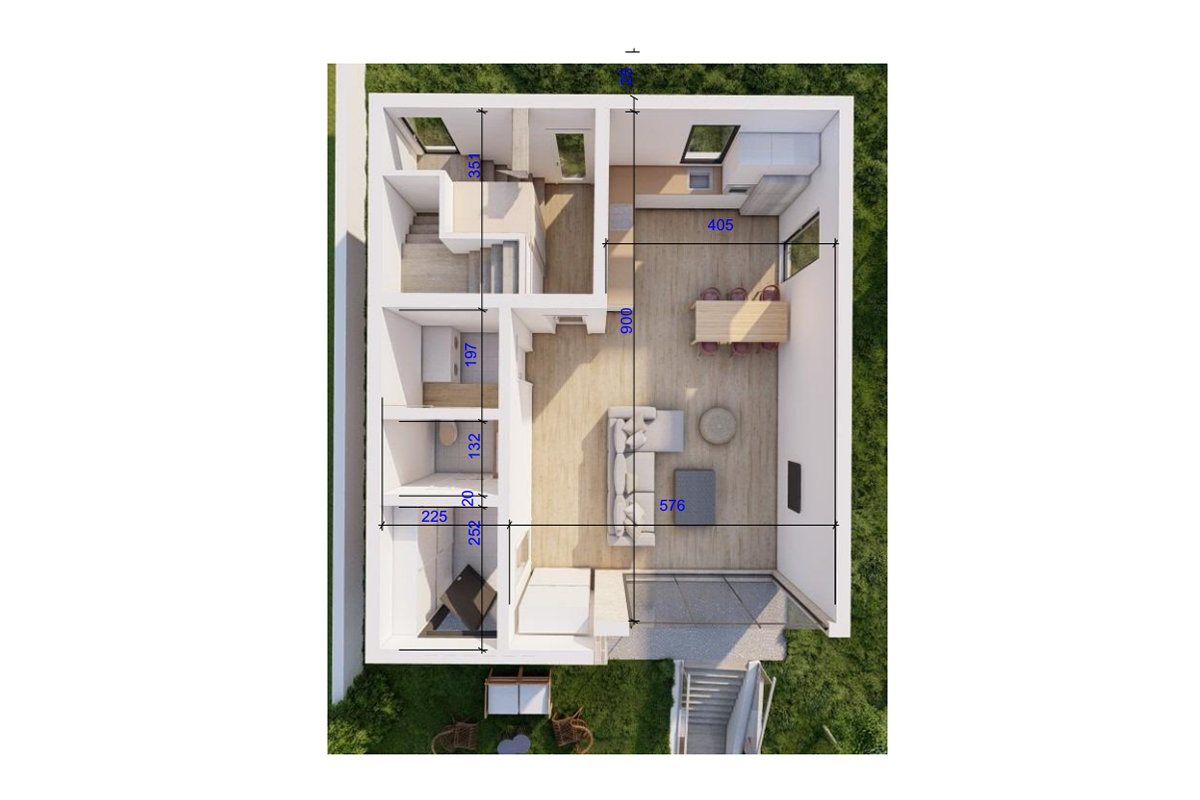 Im Erdgeschoss befinden sich ein Wohnzimmer, eine Küche mit Essbereich, ein Badezimmer und ein Abstellraum;
