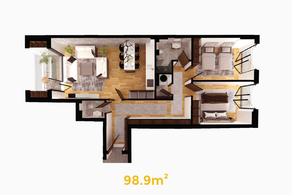 Banesa është e renditur në këtë mënyrë: qëndrim ditor, kuzhinë, dy dhoma të gjumit, një banjo, një depo, një tualet dhe një ballkon.