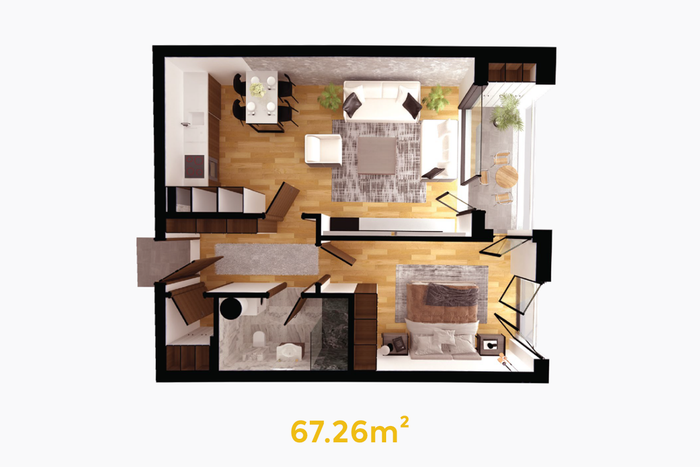 Banesa është e renditur në këtë mënyrë: qëndrim ditor, kuzhinë, një dhomë të gjumit, një banjo, një depo, një tualet dhe një ballkon.
