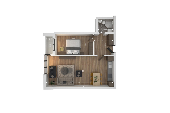 Die Wohnung hat folgende Aufteilung: Wohnzimmer mit Küche, ein Schlafzimmer, ein Badezimmer und einen Balkon. Das Heizsystem ist individuell, mit der Möglichkeit des Zugangs zum Heizsystem der Stadt, von der Seite des Thermokos und hat ein geplantes Smart Home-System.