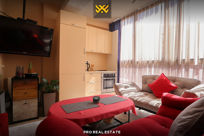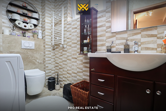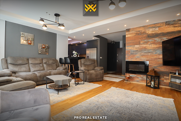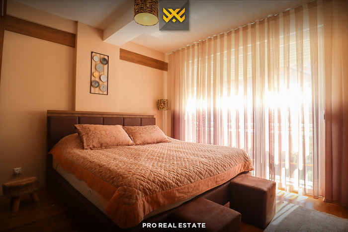 Mit Ausrichtung nach Osten und Westen hat die Wohnung folgende Anordnung der Innenräume: Wohnzimmer, zwei Küchen, vier Schlafzimmer (eins davon ist das Hauptschlafzimmer), zwei Badezimmer, ein WC und einen Balkon. Das Heizsystem wird von Termokos betrieben, das Gebäude verfügt auch über einen Aufzug, ausreichend Parkraum, drei Garagen und einen Lagerraum.