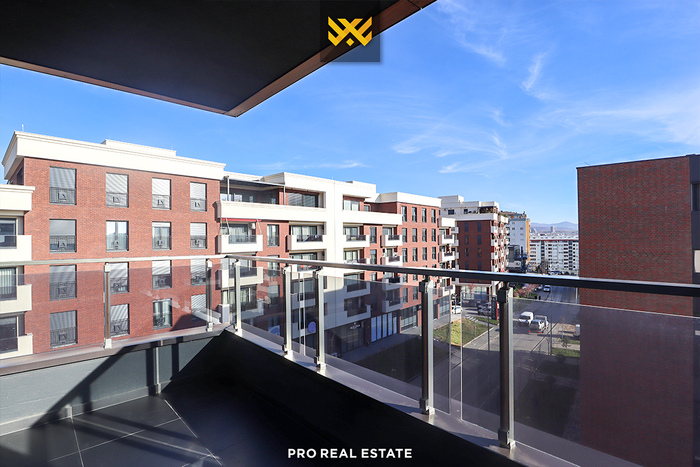 Die Wohnung hat eine Ausrichtung von allen Seiten und verfügt über folgende Anordnung der Innenräume: Wohnzimmer mit Küche, drei Schlafzimmer (eines mit eigenem Bad), zwei Bäder und zwei Balkone.