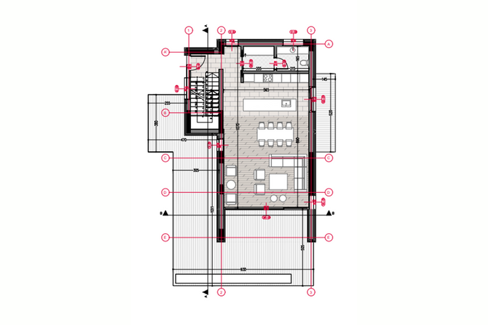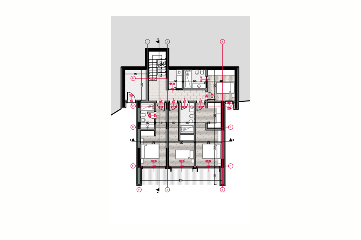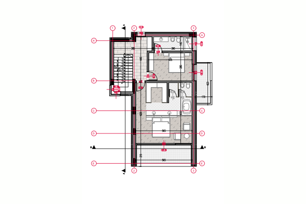 Die Villa hat eine Ausrichtung von allen Seiten, erstreckt sich über das Erdgeschoss und zwei Etagen und hat folgende Anordnung der Innenräume: Wohnzimmer, Küche mit Essbereich, sechs Schlafzimmer, darunter ein Hauptschlafzimmer, sechs Badezimmer, ein WC, Abstellraum, drei Balkone und zwei Terrassen.