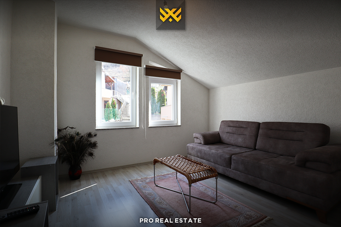 Im Erdgeschoss gibt es ein Wohnzimmer, eine Küche, ein Zimmer und ein Badezimmer;