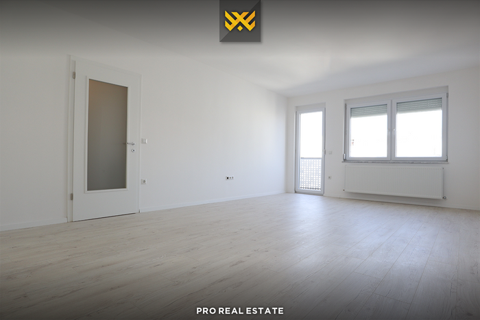 Die Wohnung hat eine Westausrichtung und folgende Anordnung der Innenräume: Wohnzimmer, Küche, zwei Schlafzimmer, ein Badezimmer, eine Toilette und einen Balkon.