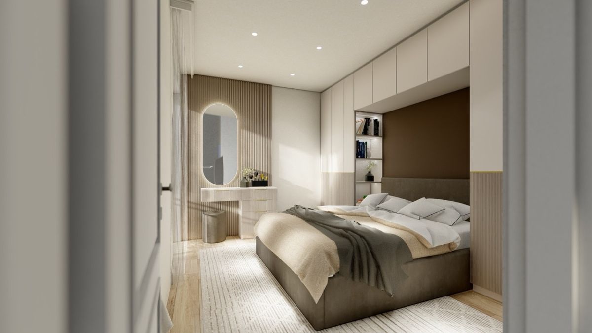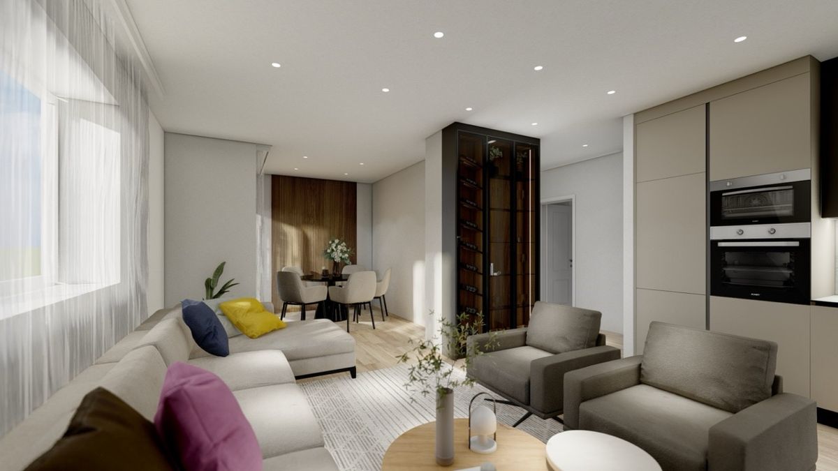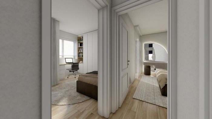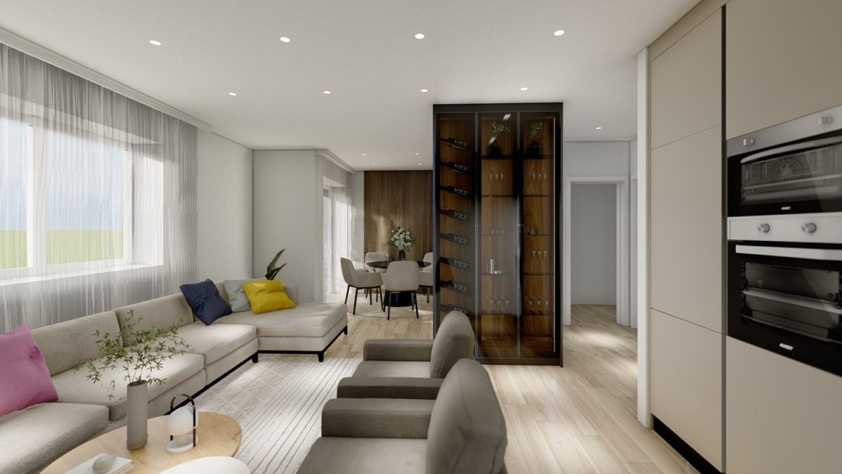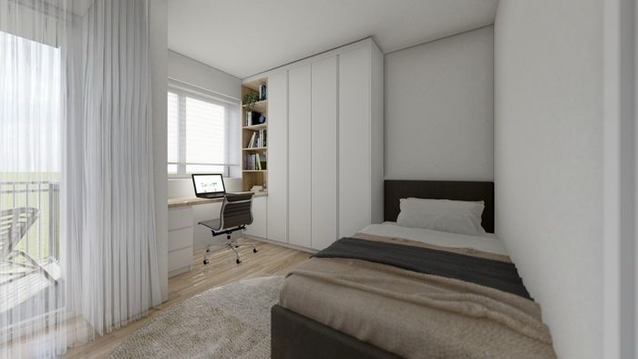 Die Wohnung hat eine Ausrichtung nach Westen und Süden und verfügt über folgende Anordnung der Innenräume: Wohnzimmer, Küche, zwei Schlafzimmer, Badezimmer und WC. Das Heizsystem funktioniert mit elektrischer Energie.