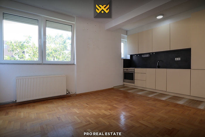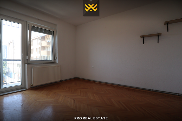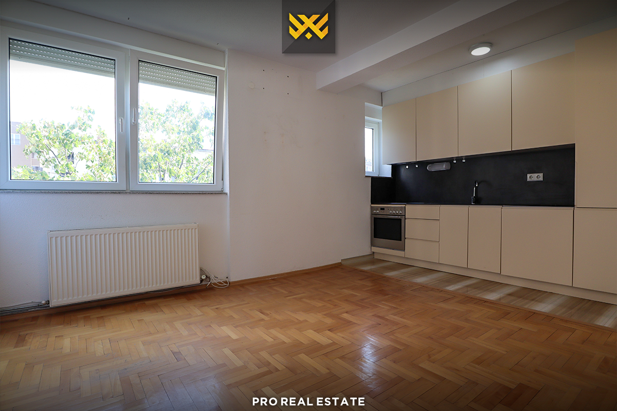 Die Wohnung hat eine Westausrichtung und folgende Raumaufteilung: Wohnzimmer, Küche, zwei Schlafzimmer, ein Badezimmer und einen Balkon.