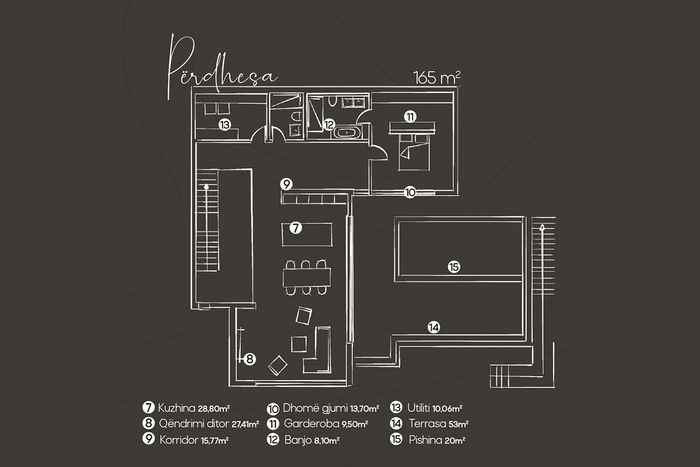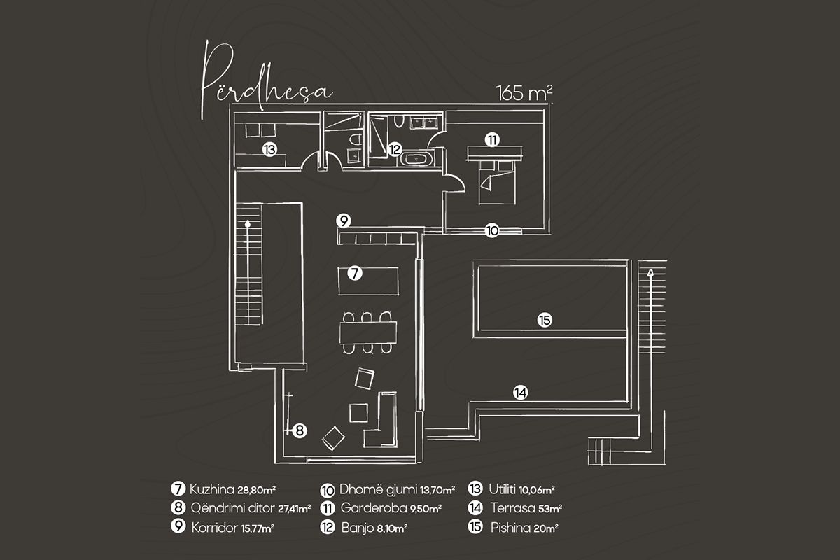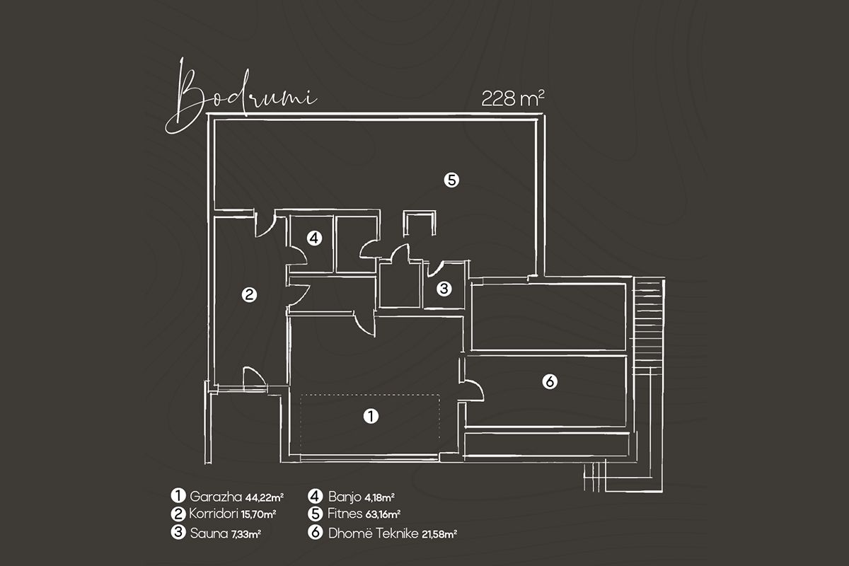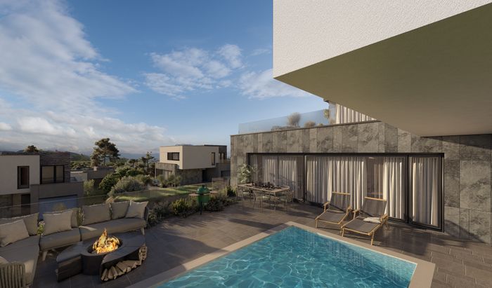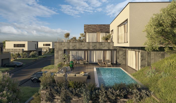 Die Typ M Häuser, die im oberen Teil der Nachbarschaft geplant sind, verfügen über einen Pool, der zusammen mit einer Wärmepumpe zur Erwärmung des Wassers während der Wintersaison integriert ist, sowie über Freizeiteinrichtungen im Untergeschoss wie Sauna, Jacuzzi und Fitness. Die natürlichen Materialien, die im Außenbereich verwendet werden, vermitteln ein warmes Gefühl und passen sehr gut in die umliegende Landschaft, was einen zusätzlichen Wert in Bezug auf Nachhaltigkeit darstellt. Als das Haus mit der größten Bruttogröße von 543 m² wurde es bis ins kleinste Detail durchdacht, um Komfort und qualitativ hochwertige Wohnräume zu bieten.