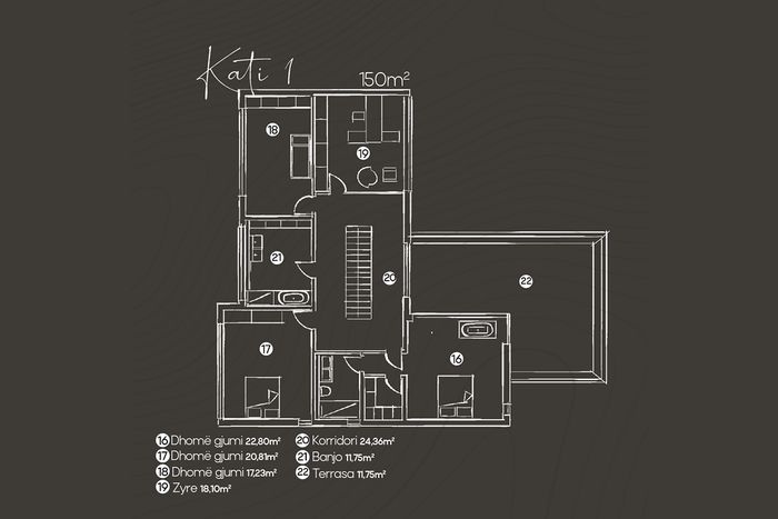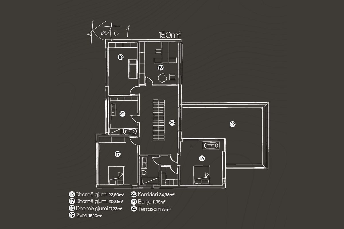 Das Haus hat eine geeignete Ausrichtung, die es allen Innenräumen ermöglicht, maximal natürliches Licht zu sammeln. Das Typ M Haus ist in ein Untergeschoss, ein Erdgeschoss und ein Obergeschoss unterteilt mit folgender interner Organisation: Im Untergeschoss befinden sich eine Garage, ein Technikraum, ein Badezimmer, ein Fitnessraum und eine Sauna. Im Erdgeschoss gibt es einen Wohnbereich mit Küche und Essbereich, ein Schlafzimmer mit Ankleideraum und eigenem Badezimmer, einen Hauswirtschaftsraum, ein WC, eine Terrasse mit einer Fläche von 53 m² und einen Pool. Im ersten Stock befinden sich drei Schlafzimmer, ein Büro, ein Badezimmer, ein WC, ein Abstellraum und eine Terrasse mit einer Fläche von 11,75 m². Auch das Gründach, auf dem sich der Regenwasserspeicher und die Solarpanels befinden. Das Grundstück hat eine Fläche von 11,72 Ar.