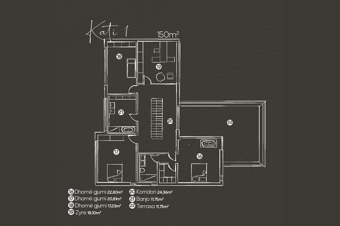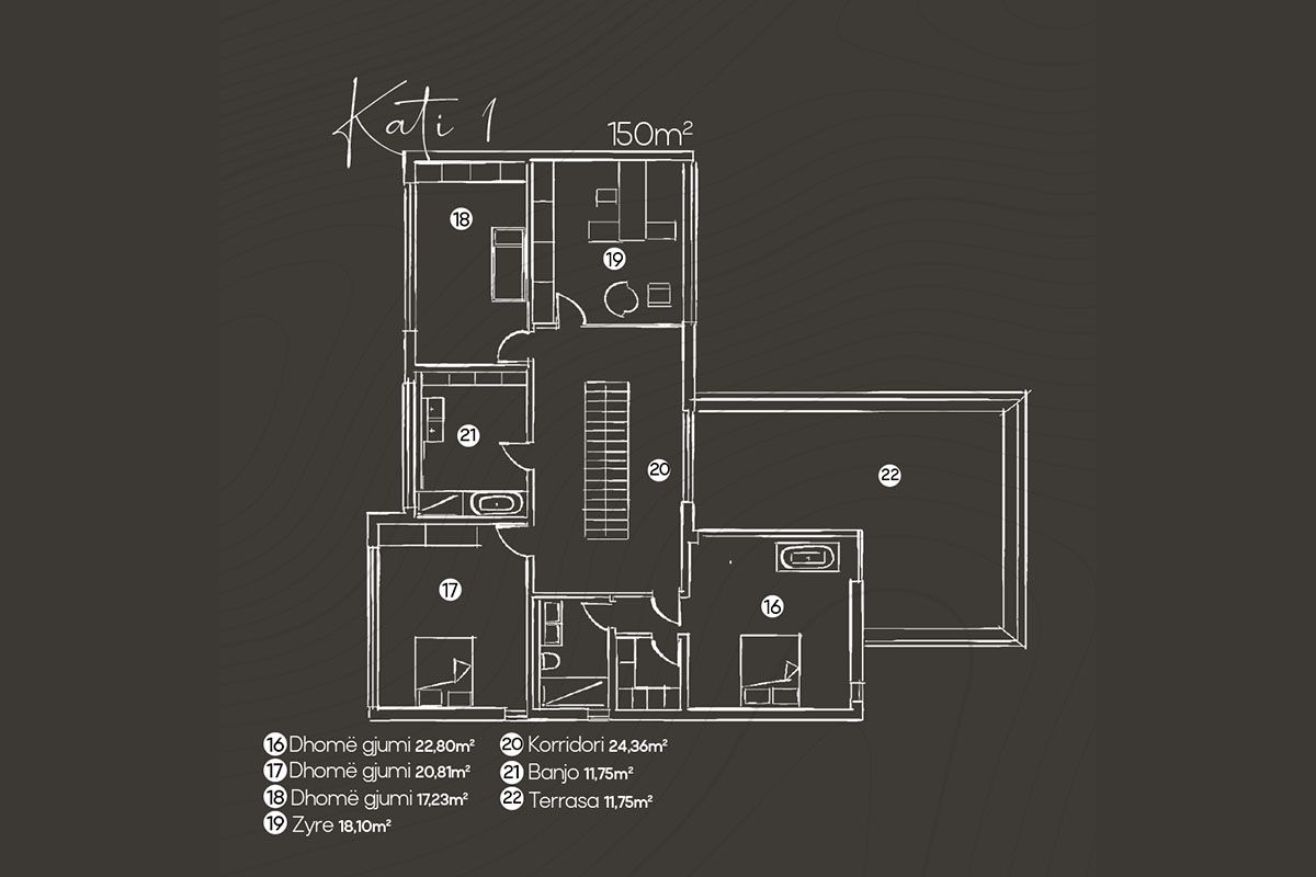 Das Haus hat eine geeignete Ausrichtung, die es allen Innenräumen ermöglicht, maximal natürliches Licht zu sammeln. Das Typ M Haus ist in ein Untergeschoss, ein Erdgeschoss und ein Obergeschoss strukturiert mit folgender interner Organisation: Im Untergeschoss befinden sich eine Garage, ein Technikraum, ein Badezimmer, ein Fitnessraum und eine Sauna. Im Erdgeschoss gibt es ein Wohnzimmer mit Küche und Essbereich, ein Schlafzimmer mit Ankleidezimmer und eigenem Badezimmer, einen Utility-Raum, eine Toilette, eine Terrasse mit einer Fläche von 53 m² und einen Pool. Im ersten Stock befinden sich drei Schlafzimmer, ein Büro, ein Badezimmer, eine Toilette, ein Abstellraum und eine Terrasse mit einer Fläche von 11,75 m². Auch das Gründach, auf dem sich der Regenwasserspeicher und die Solarpanels befinden. Das Grundstück hat eine Fläche von 11,72 Ar.