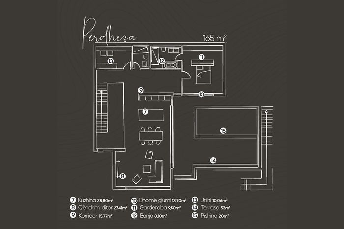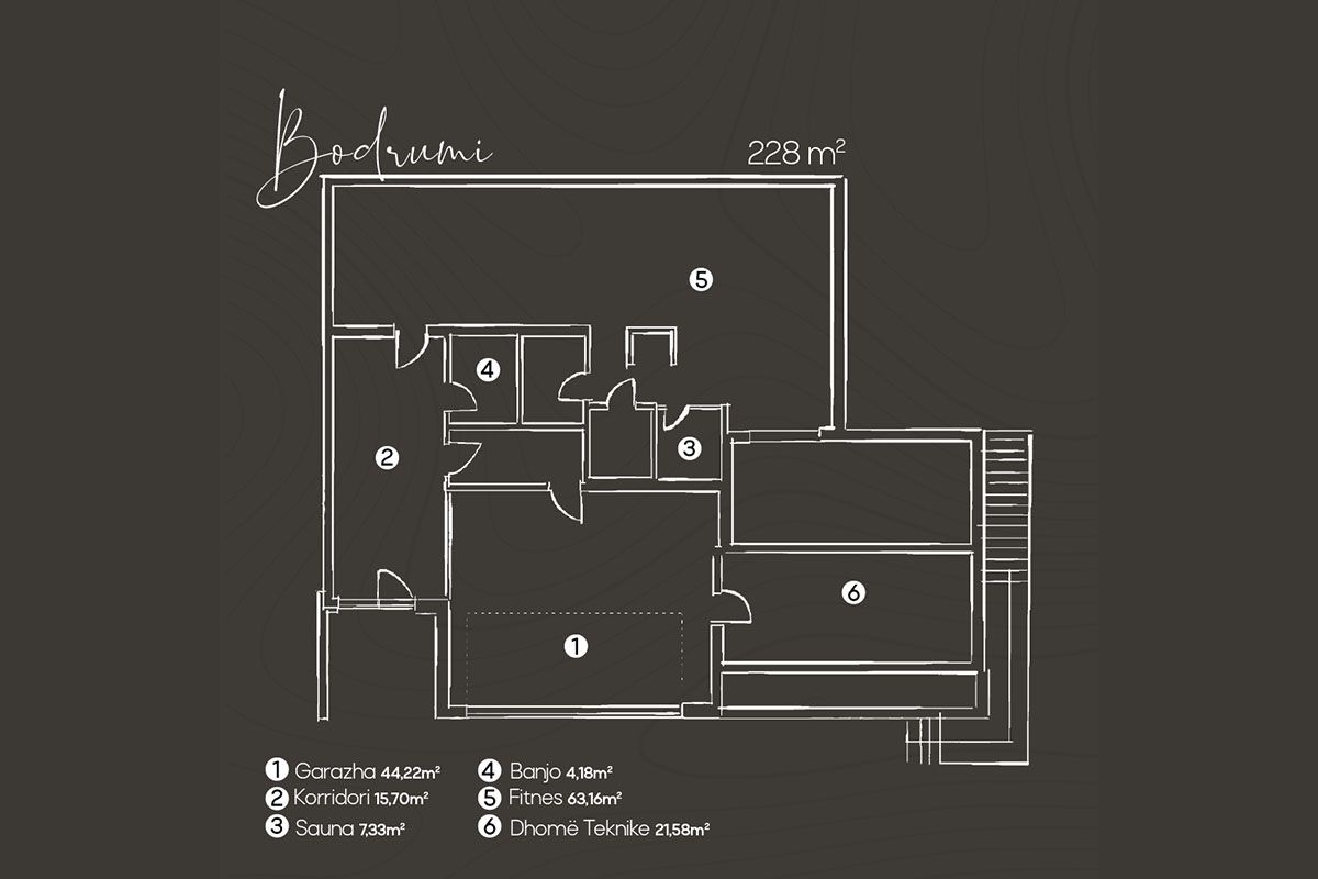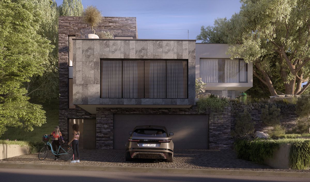 Die Typ M Häuser, die im oberen Teil der Nachbarschaft geplant sind, haben insbesondere den Pool zusammen mit der Wärmepumpe zur Erwärmung des Wassers während der Wintersaison sowie Freizeiteinrichtungen im Untergeschoss wie Sauna, Jacuzzi und Fitnessraum. Die natürlichen Materialien, die im Außenbereich verwendet werden, vermitteln ein warmes Gefühl und passen sehr gut in die umliegende Landschaft, was einen zusätzlichen Wert für die Nachhaltigkeit darstellt. Als das Haus mit der größten Bruttofläche von 543 m² wurde es bis ins kleinste Detail durchdacht, um Komfort und qualitativ hochwertige Lebensräume zu bieten.