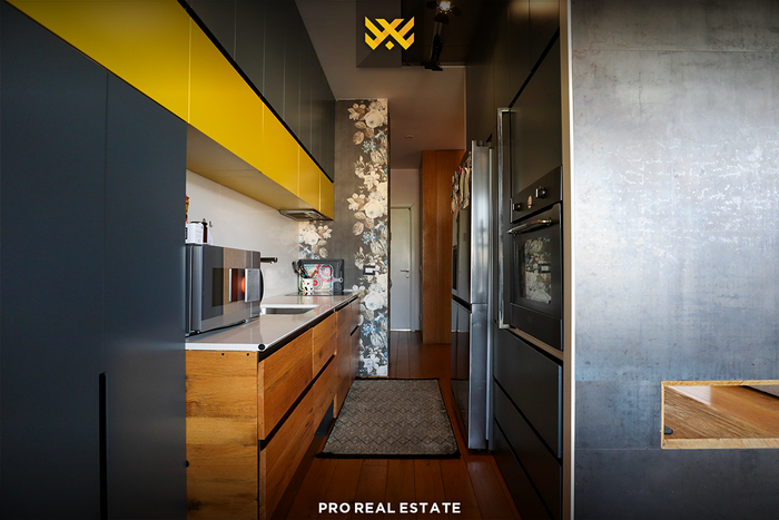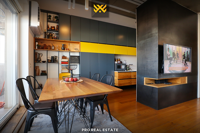 Die Wohnung hat eine Ausrichtung nach Osten, Westen und Süden und verfügt über folgende Anordnung der Innenräume: Wohnzimmer, Küche mit Essbereich, drei Schlafzimmer, eines davon mit eigenem Bad, ein Badezimmer, Balkon in jedem Zimmer und eine große Terrasse.
