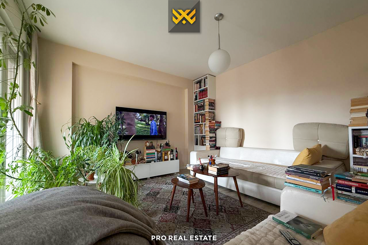 The apartment is situated in a well-developed area with noticeable foot traffic, with access to the main road as well as close to all necessary services.