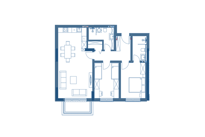 The apartment has a west orientation and features the following layout: living room, kitchen, two bedrooms, bathroom, toilet, storage, and balcony.