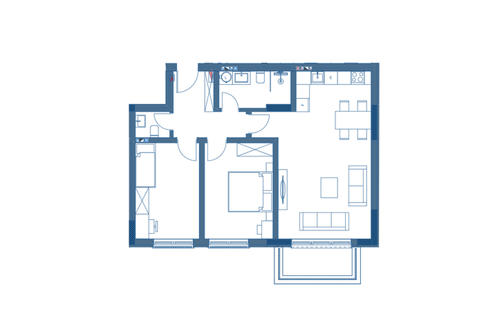 The apartment has an east and south orientation and has the following layout of internal spaces: living room, kitchen, two bedrooms, bathroom, and balcony.