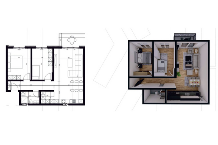 The apartment has the following layout of internal spaces: living room, kitchen, two bedrooms, bathroom, and balcony.