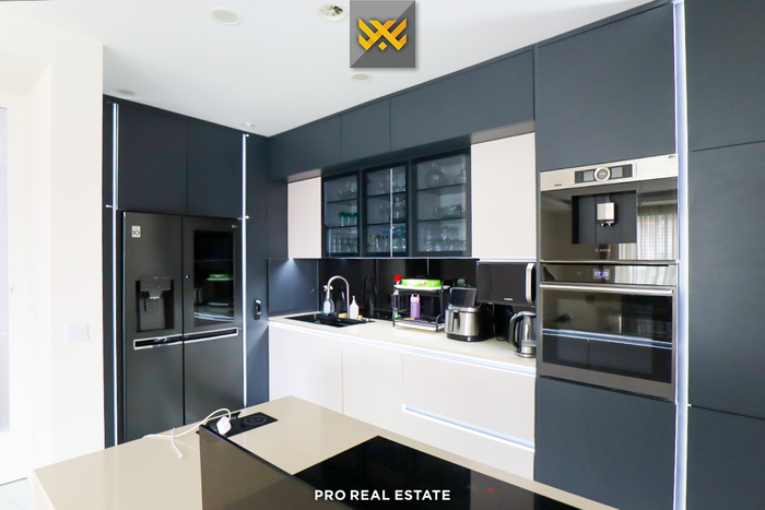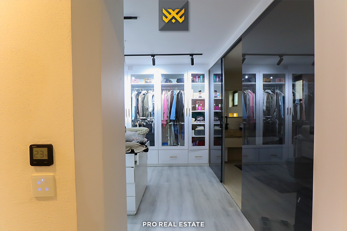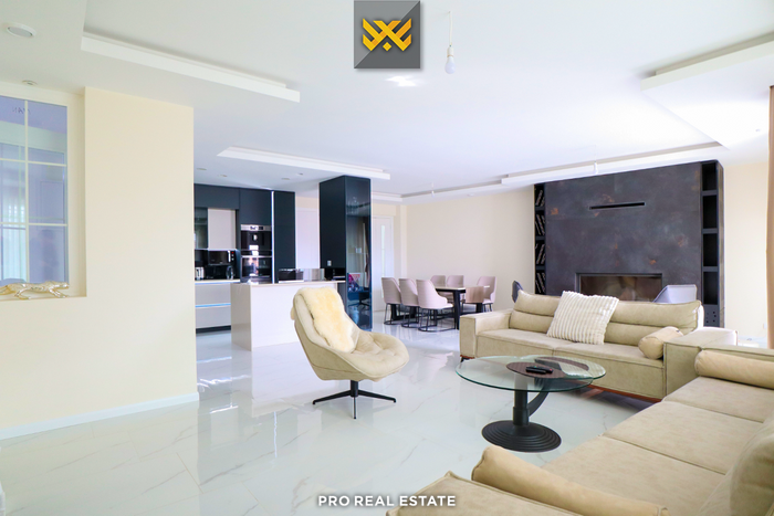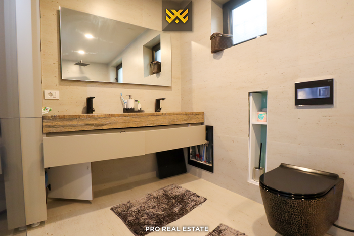 The house has a plot of land with an area of 6.5 Ari, features a 1500l water reservoir, has an oil tank, and a garage with an area of 83m², includes a ventilation system for clean air and approximately 70% smart home for easy control of main functions. The modern design is complemented by an elegant fireplace, while security is ensured with cameras and an alarm. For maximum relaxation, it also includes a steam sauna.