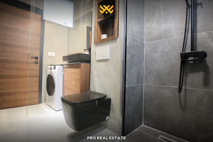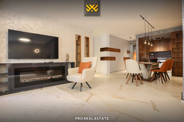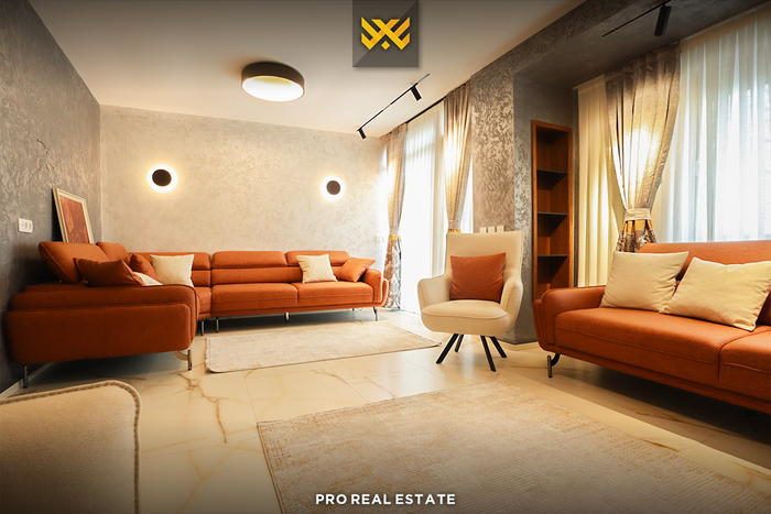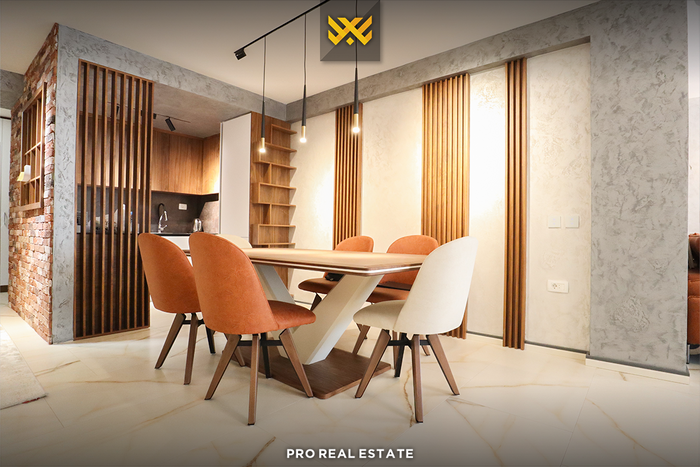 The apartment is fully furnished with a harmonious combination of modernity and warmth, characterized by wooden details that create a welcoming atmosphere.