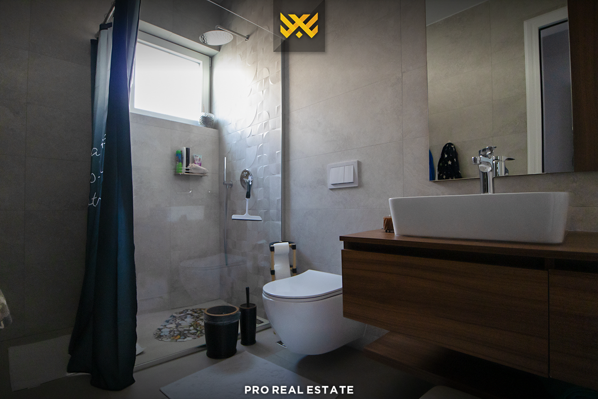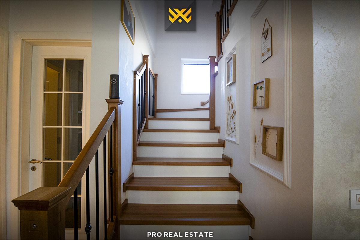 The house has an orientation from the east, south, and north, allowing for sufficient natural lighting. It is offered on the ground floor, first floor, and attic with the following layout of spaces: a living room, kitchen with dining area, three bedrooms, one of which is a master with a bathroom and wardrobe, three bathrooms in total, two storage rooms, two balconies, and sufficient space in the attic.