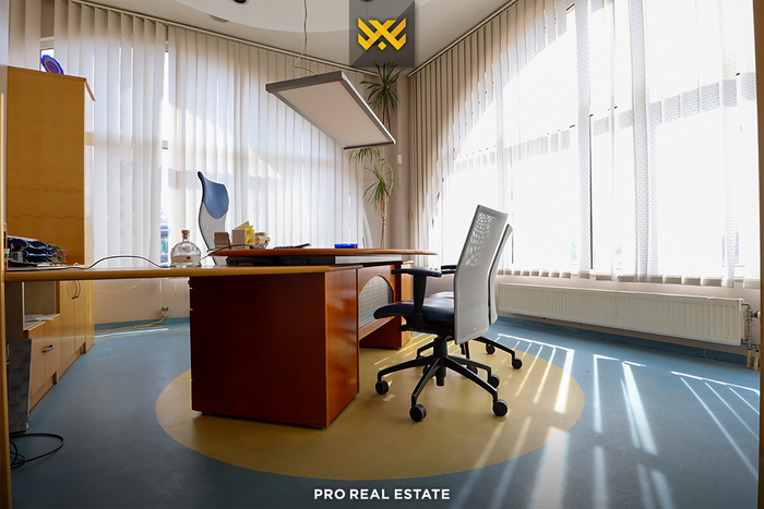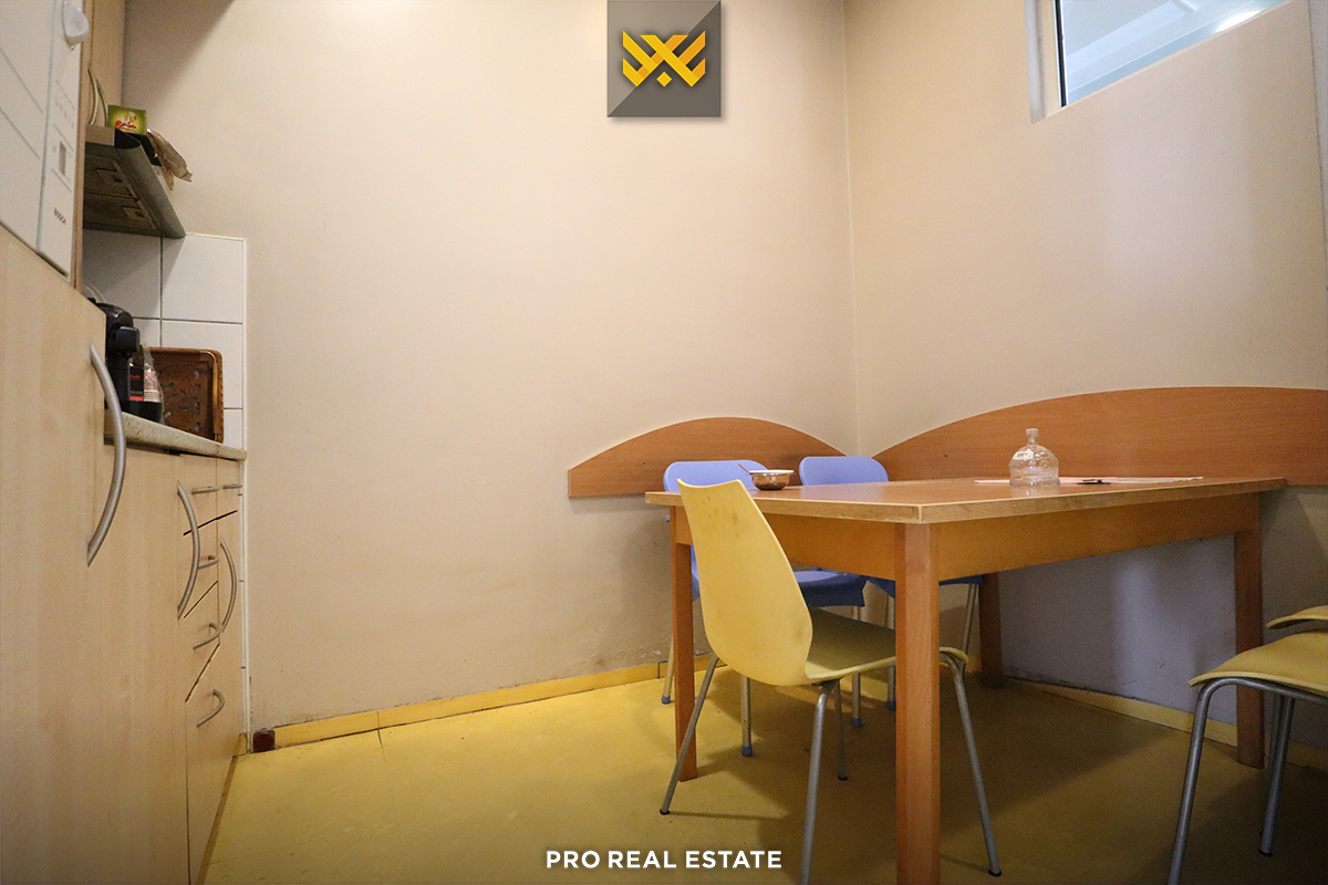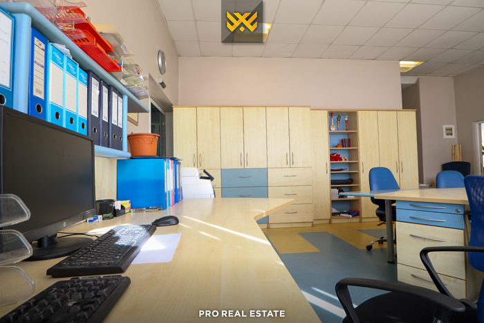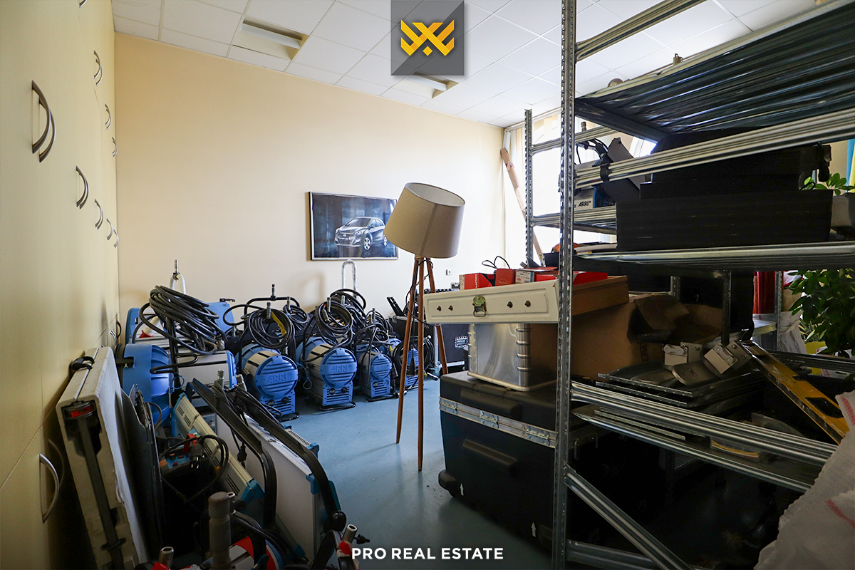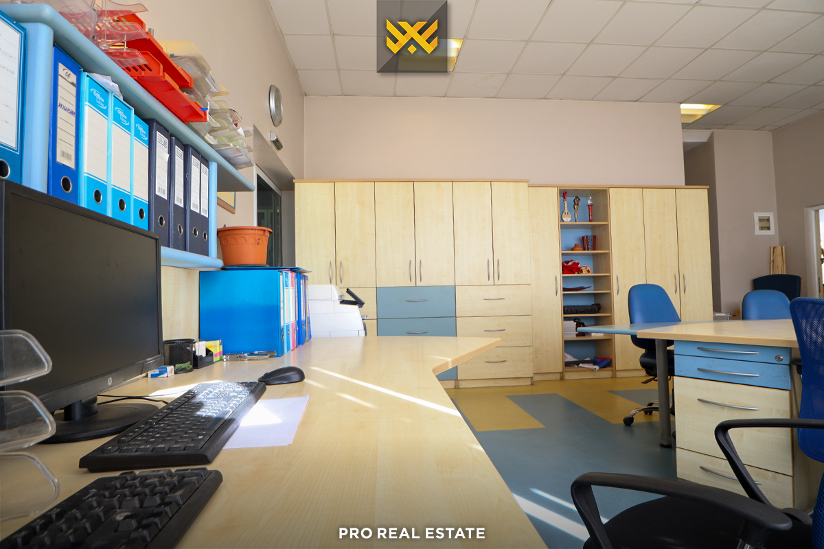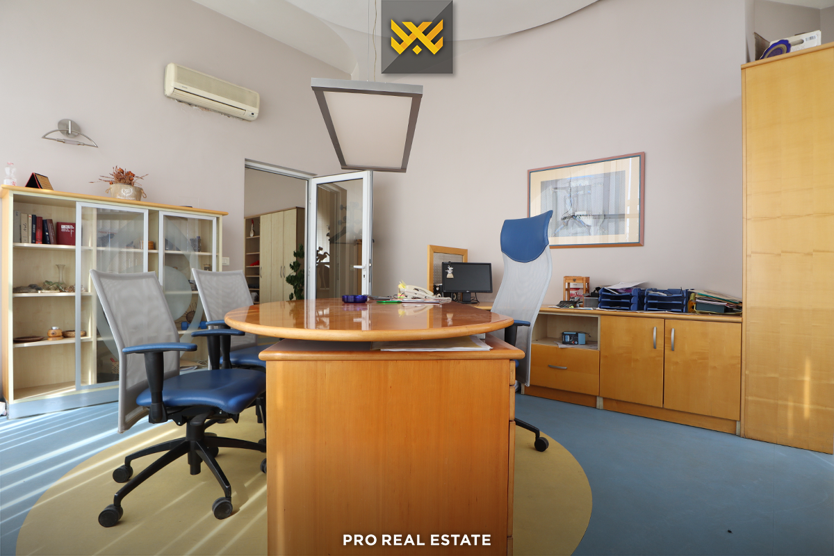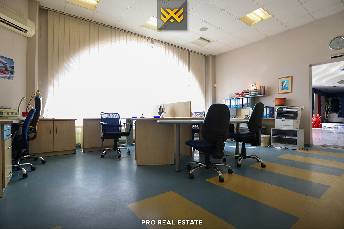 The space has orientation from all sides, includes an area of 180m² that can be used as a showroom, three offices, a kitchen, and a large area for storage.