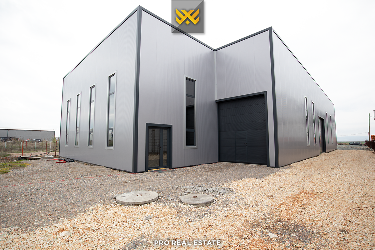 The warehouse is built to high standards with a height of 6m, 10cm panels imported from Greece, has three entrances, and offers outdoor parking.